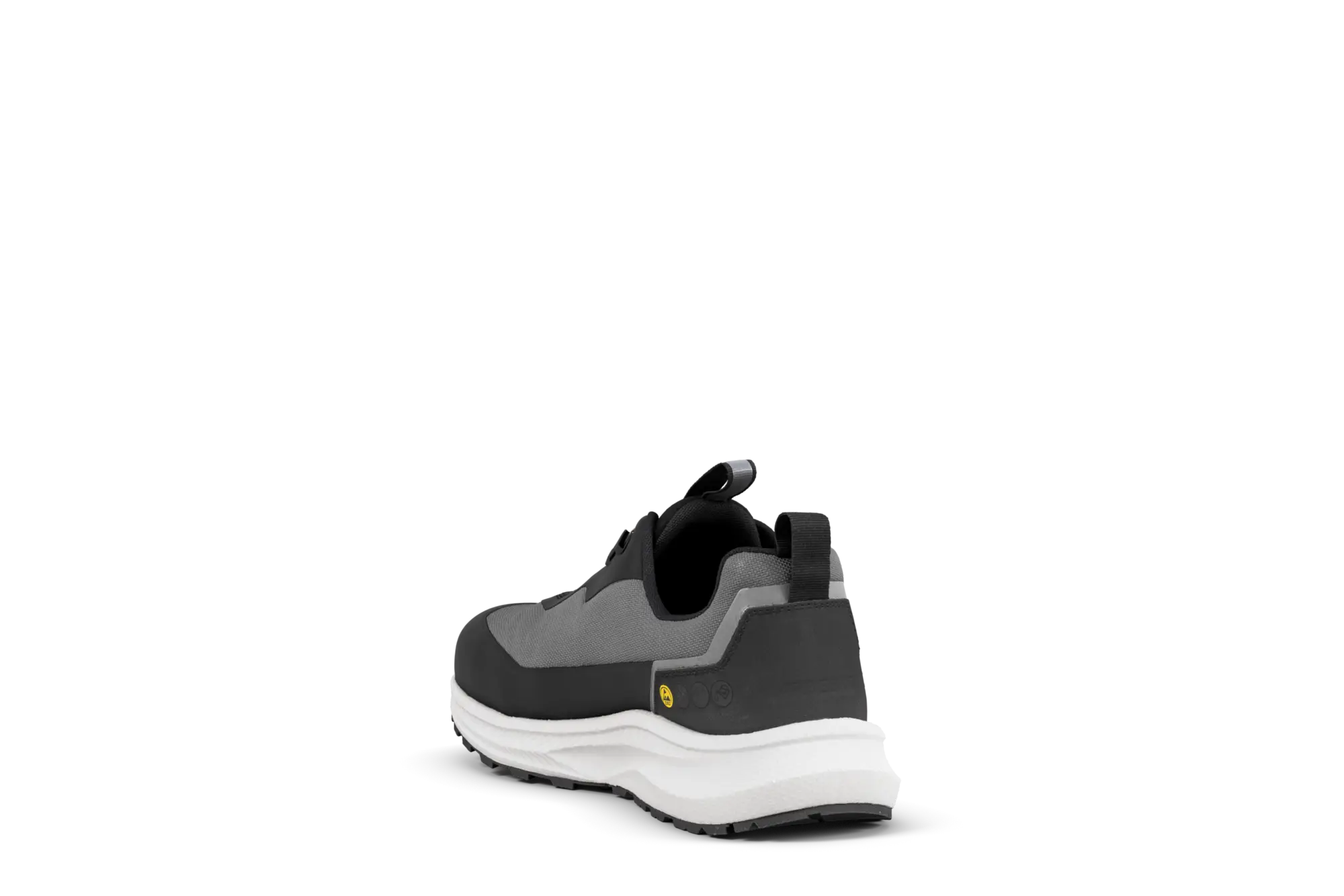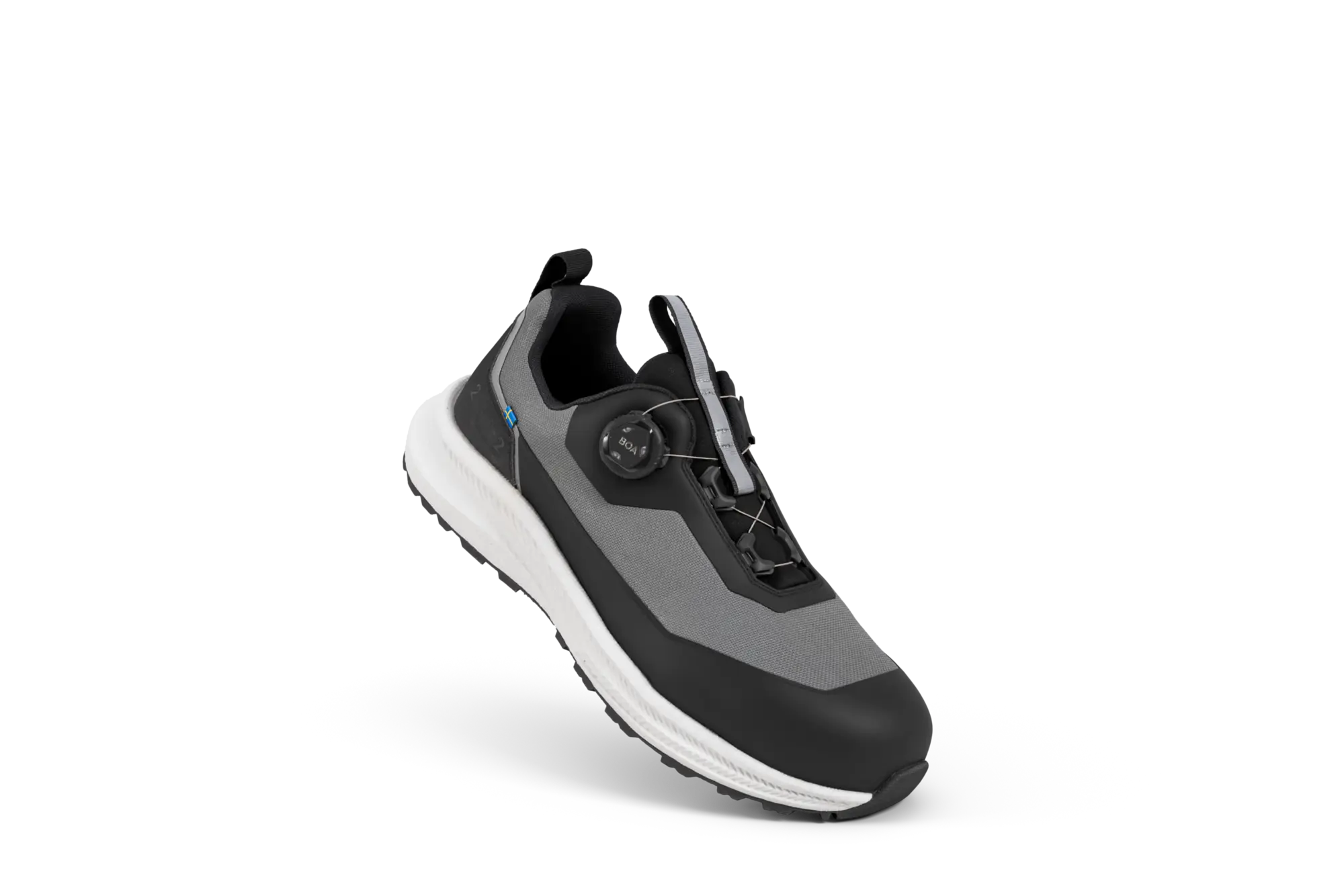 Den vattenavvisande ovandelen i slitstark textil skyddar mot fukt, smuts och vardagligt slitage, samtidigt som konstruktionen behåller en smidig och följsam känsla runt foten. Designen i grått med vit sula ger ett rent, tekniskt uttryck som passar lika bra i industri och lager som i verkstad och service.